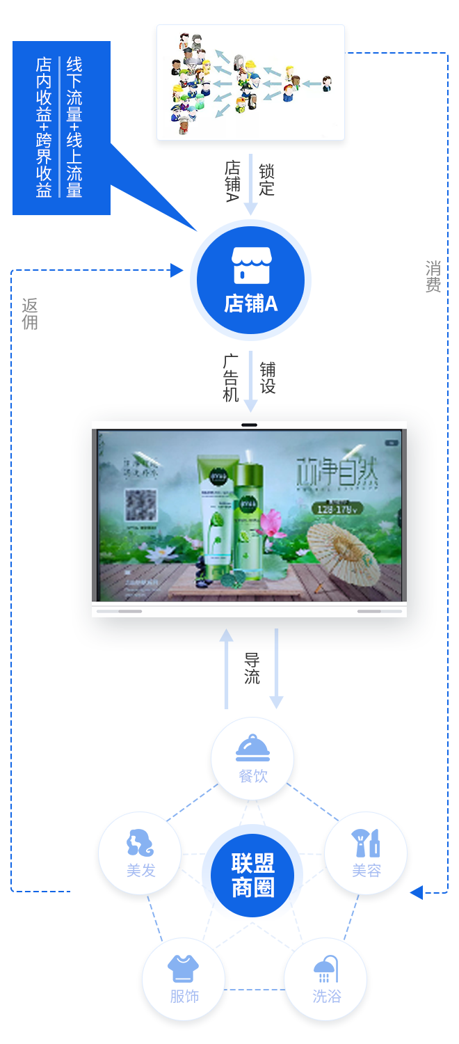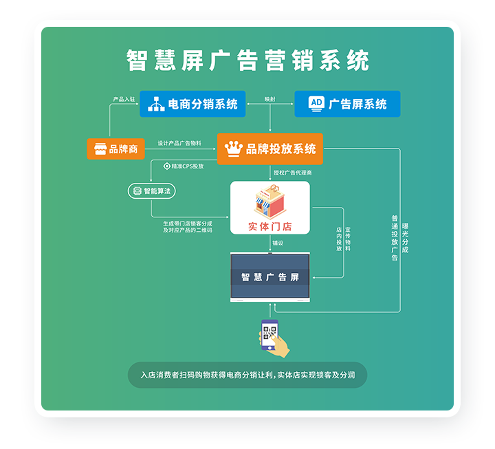 通过线上便捷的操作,让店主可以随时随地进行门店营销宣传、实现引流裂变,让广告营销像发朋友圈一样简单!节省人工和物料成本。同时还能通过”共享屏幕“进行广告投放,实现跨界盈利。